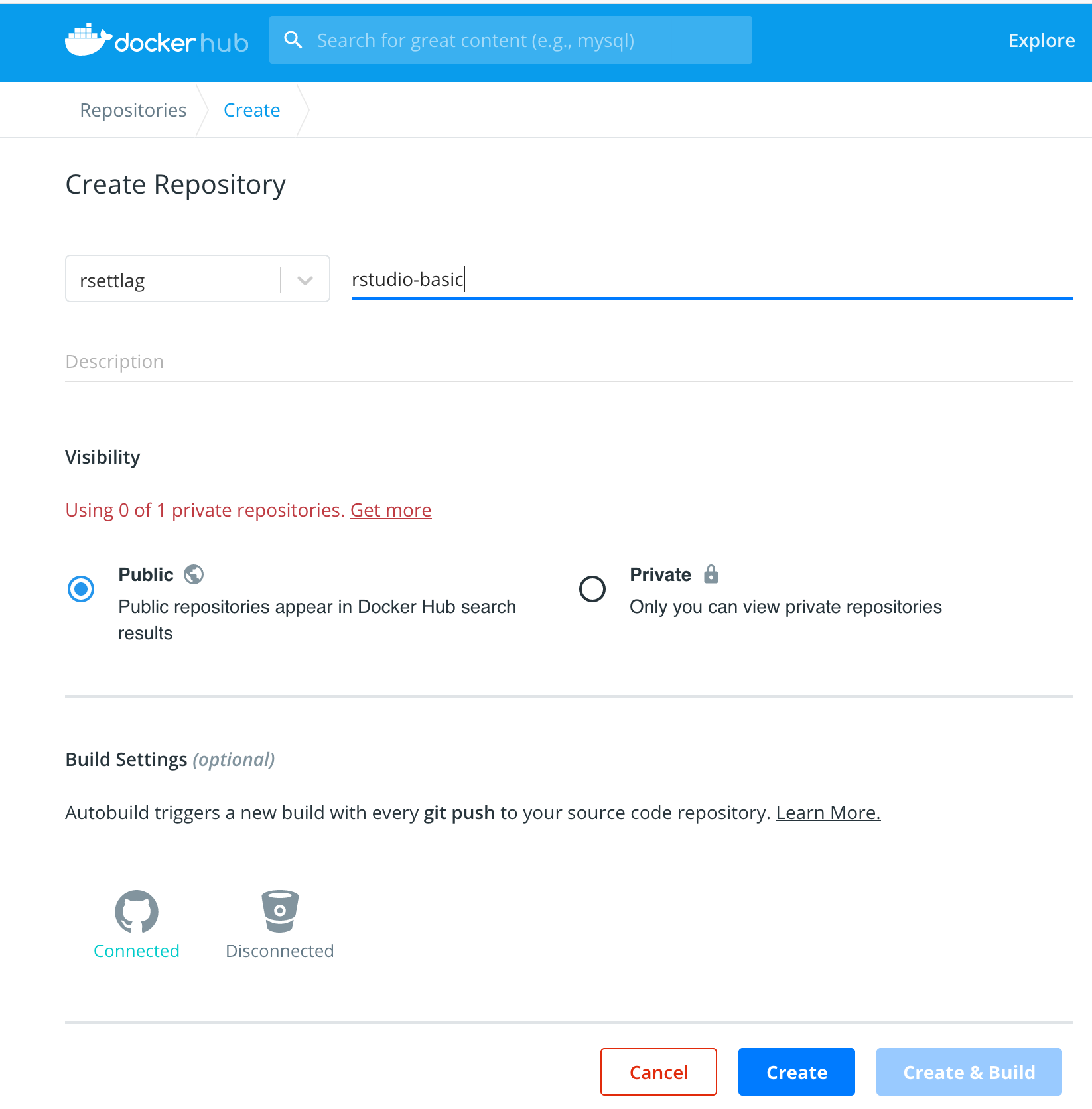 This can take a little while, but it will build on the DockerHub servers. Note, any changes upstream from this image will trigger a new build. Ideally, you would use versioning to protect against upstream changes. If that is a possibility and a problem, turn off auto build after the image is built to your liking.